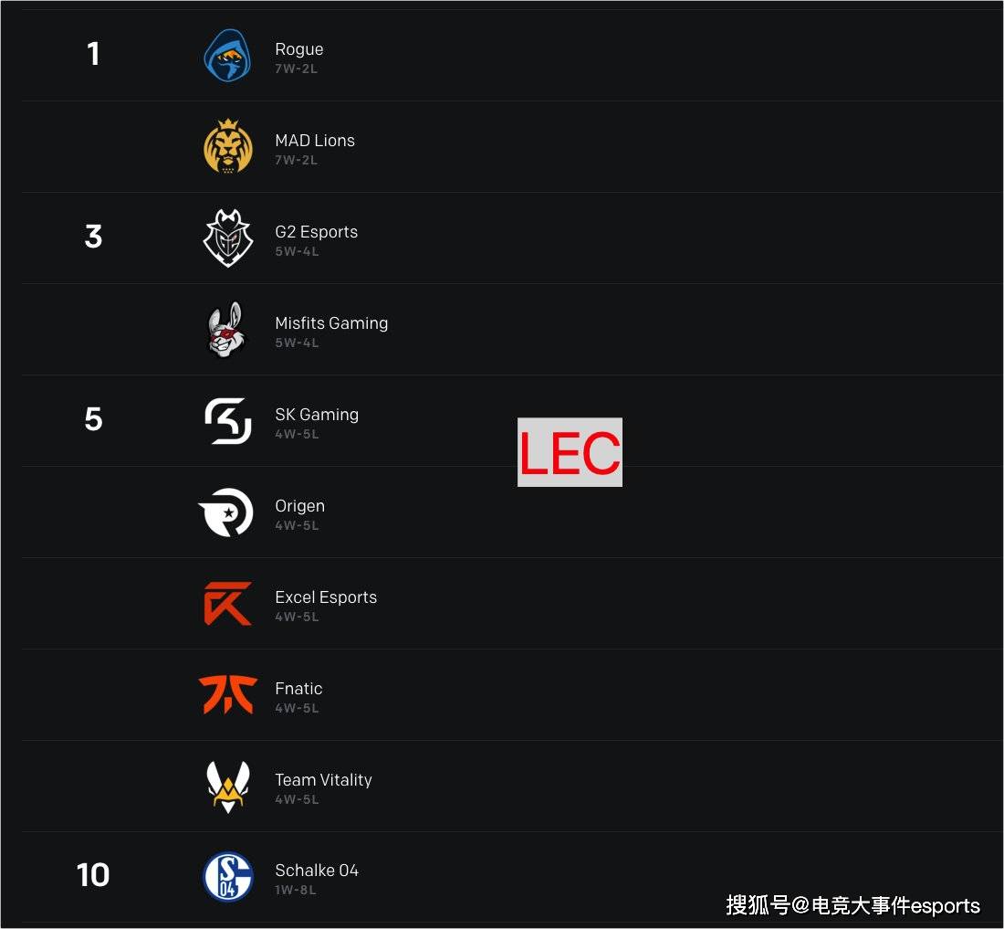 欧洲赛区本周头名位置有变化,MAD和RGE并列第一名,另外就是MSF兔子队和G2在本周的排名甩开了其他中游的队伍,并列第三,之后的队伍都是并列第五,当然S04也是终于拿到了赛季首胜,你知道是在谁身上拿到的吗?