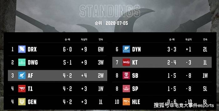 LCK赛区本周的形势变化并不大,DRX依旧以不败战绩领跑整个联盟,DRX也是两战全胜继续占领第二名,有趣的是AF从上周的第六名一跃成为了第三名,DYN的两连败也是直接被取代,T1和GEN上周都是1-1的战绩,所以排名无变化。