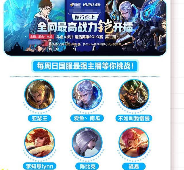 更有游戏大咖冰泪淑芬和疯油精强势入驻,让斗鱼板块的整体实力又在大大提高,不过最让玩家期待的还是7月份最引人瞩目的SOLO赛,就是每周都会抽一个主播用他自己的国服第一英雄来和网友进行单挑比赛,谁都可以过来挑战,无论是职业选手,大神,小学生,同台主播都是没有问题的,斗鱼主播都接受应战.