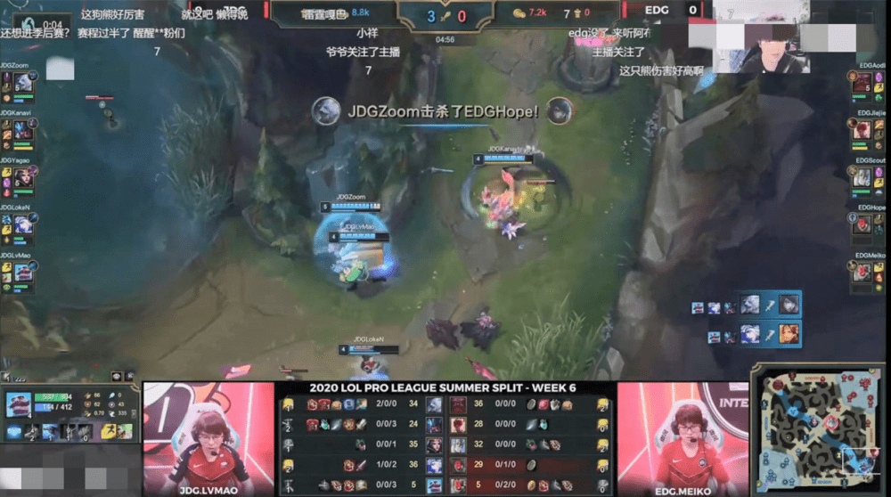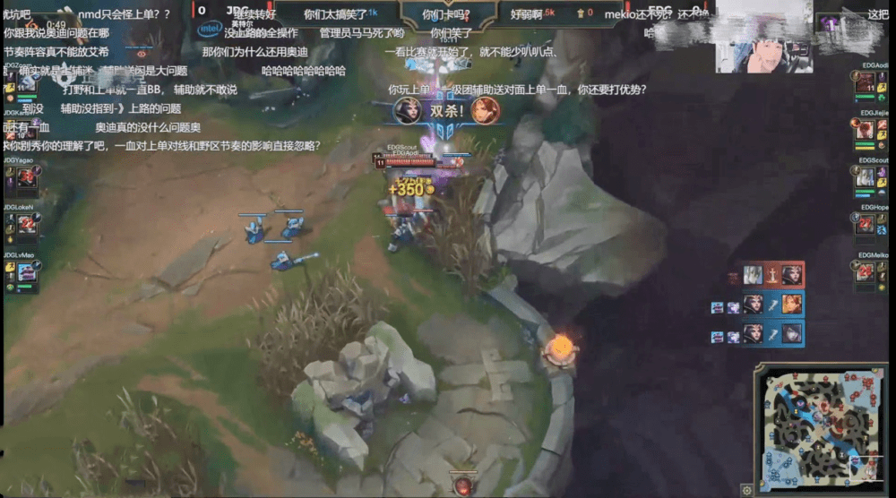 “EDG的希望”Hope选手伤病痊愈归队后也让许多粉丝对这场比赛充满了期待,但是无奈,开局不利,Meiko在野区被抓,闪现未能成功逃跑被JDG击杀拿下一血,用闪现换了一个治疗。前期狗熊TP下路帮助下路反蹲建立下路优势,而上单奥迪并没有选择TP,这波也让Zoom和Loken各收获一个人头。前期EDG下路处于略微劣势的局面。阿布对此称:“奥迪不选择交TP保,也没有选择阻断熊,因为熊是刚回家就来下路的。”对于奥迪没有交TP这件事也重复了几次,弹幕表示,这也不是奥迪的问题,即使TP下来也改变不了局面,并且这应该也是团队指挥的决定。