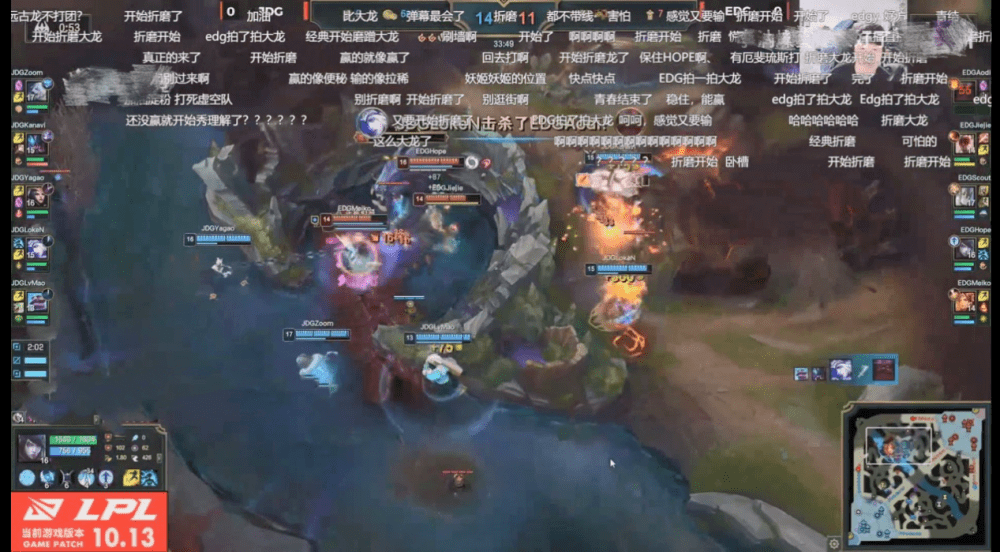 后面在EDG全线劣势的情况下,Jiejie站了出来抢到了大龙,给了EDG翻盘的希望!奥迪在大龙坑里也R起了三人,但阿布对此并没有说太多,依旧在分析局势。而后EDG成功拿下远古龙,翻盘胜券在握!但在最关键的一波大龙团战,奥迪在龙坑右侧的河道口想要限制JDG,但是被艾希的剑射中,五人集火的情况下奥迪甚至没有放出大招就阵亡了。而龙坑里队友打龙的速度也不够快,在奥迪被击杀后虽然拿下了大龙但不能第一时间撤退,被对面团灭,错失了翻盘的机会。