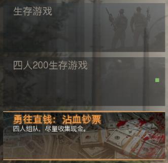 战争地带列表包括:生存游戏(单人、双人、三人)、四人200生存游戏和勇往直钱:沾血钞票。