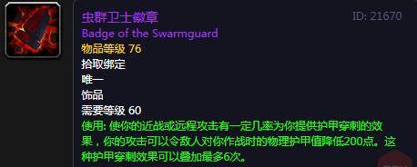 虫群卫士徽章的破甲效果可以明显提高狂暴战的DPS,在WOW里,护甲对物理伤害的减免很高,战士破甲、术士鲁莽、小德精灵之火能够削减BOSS总计3395点护甲,按照60年代的数据,BOSS还会大概存留1300左右的护甲,再加上虫群卫士徽章的1200点破甲,能让BOSS的护甲削减到极低的数值。
