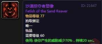但从怀旧服的DPS来看,BOSS的护甲有可能是削弱过的,鉴于BOSS的护甲不能小于0的缘故,那么BOSS的护甲削弱得越多,虫群卫士徽章的效果就越容易溢出,收益会越低。反而另一件饰品沙漠掠夺者塑像的减仇恨似乎更吸引现在的玩家,开启后持续20秒减70%仇恨,可以让狂暴战放开去打,尤其是在斩杀阶段,有了这件饰品,狂暴战玩家们可以在斩杀阶段尽情飚DPS。