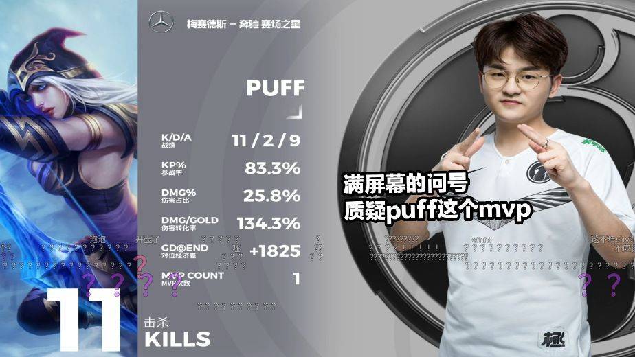 而在IG赢下比赛后,其实还发生了一个小插曲,那就是第三局的mvp问题。第三局IG的几个人发挥的都非常出色,上中的带线牵扯,宁王打团盯着AD,让厄斐琉斯打不出输出,Puff前期因为各种各样的原因,没能和队友配合到一起,但是后期收割能力还可以,所以第三局的mvp给谁就成了一个问题,最后官方再三考虑后给了puff,这是他夏季赛的第一个mvp。但很明显大多数观众认为上中野是比Puff更配得上这个mvp,所以看到给puff的时候,满屏幕的问号打了出来,怀疑是不是哪里出了问题。