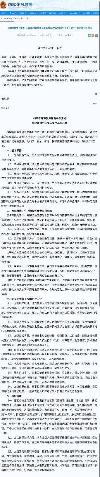 国家体育总局已印发《科学有序恢复体育赛事和活动推动体育行业复工复产工作方案》,各地体育局已陆续收到通知。