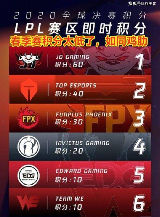 而对于御三家的EDG,WE,RNG和远古豪门IG来说,他们春季赛的积分其实都不高。由于众所周知的原因,S10春季赛的积分大幅下滑,第一名60分,第二名40分,第三名30分,第四名20分。除了前四名外,五六名的积分只有10分,形同鸡肋。