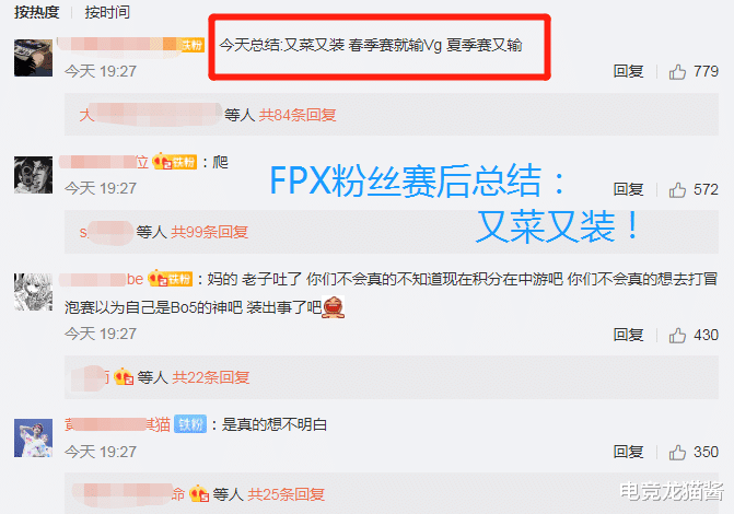 这场比赛结束后,FPX战队的一些粉丝怒不可遏,直接在官博下方发表了今日观赛总结:“又装又菜!春季赛输了VG,这次又输VG!你们还想进季后赛吗?你们还能打进S10世界赛吗?”,其实笔者自己也喜欢FPX战队,也很能理解这些粉丝的心情,但木已成舟,比赛已经结束了。过多地去指责队员,指责教练,并不会让FPX变得更好。比赛输了不可怕,重要的是FPX队内得尽快找到输比赛的原因。
