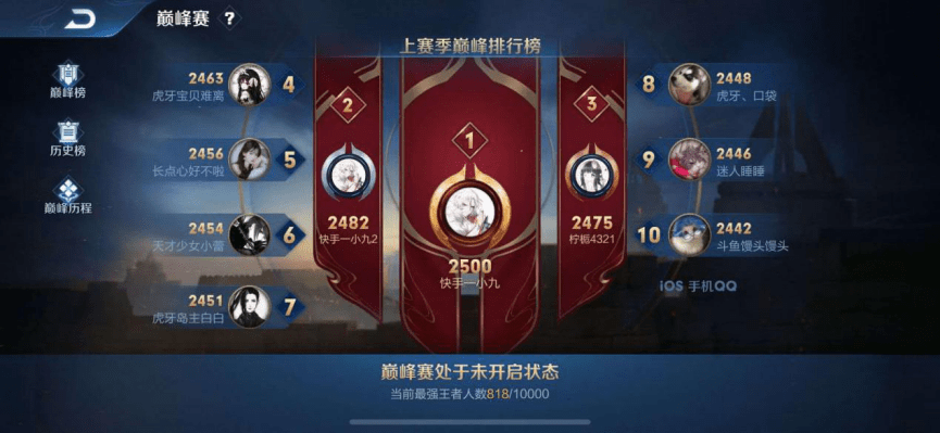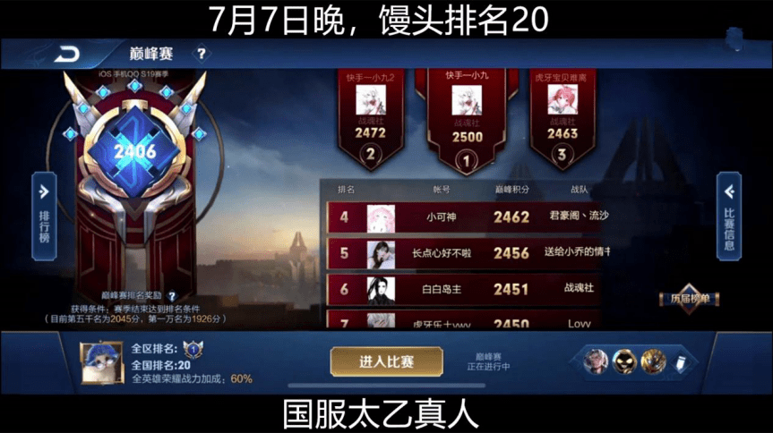 然而,一晚上的巅峰赛打下来,馒头的胜场还是很多的。最终,他上分成功,用了大概4个小时的时间,冲进了巅峰榜前十,圆满完成了任务。