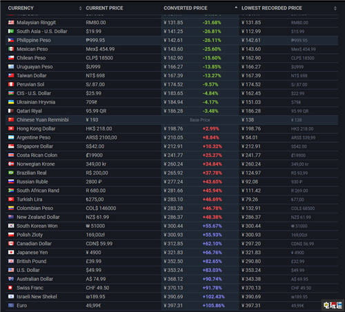 在《地平线:零之曙光完全版》国区售价暴涨两倍的同时,传统“低价区”的土耳其区涨幅超过357%,阿根廷区的价格涨幅超过388%,俄区涨幅也超过301%。不过在国区二次调整价格时,其他地区并未再次上涨。只能希望国区的价格不要像以上几个地区一样涨幅突破300%了。