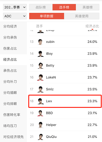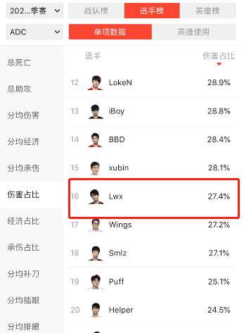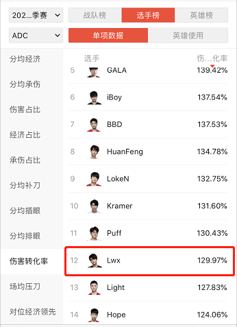 有关LWX的实力到底怎么样这个话题,自从今年的夏季赛开始,网友们就争论不休。今年这个夏季赛的赛程已经过半,但是LWX的数据表现确实不太好。他的场均击杀在LPL所有的AD中排行13,分均伤害排行14,伤害占比平均每场27.4%,排在第16位,伤害转化率排行12。可以说,在LWX的各项数据中,基本就没有太靠前的。