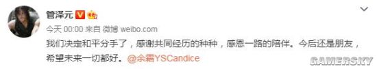 《英雄联盟》LPL官方解说管泽元和官方主持人余霜今天凌晨在微博上宣布和平分手,二人文案相同:“我们决定和平分手了,感谢共同经历的种种,感恩一路的陪伴。今后还是朋友,希望未来一切都好。”两人分手的消息也登上了微博热搜第一。