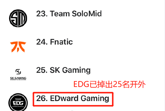 另外值得一提的是,在ESPN公布的战队排行榜里,前十位我们LPL赛区就占据了5个名额,分别是第一名的TES,第二名的V5,第八、九、十名的FPX,IG,JDG。WE战队排名12,Faker带队的T1由于近期输给了LCK新军DYN,所以是掉到了14名的位置,而第15则是我们所熟悉的RNG。而EDG战队由于近期战况惨烈,已经是掉出了25名开外的位置,目前仅排名26,实在是令人唏嘘。