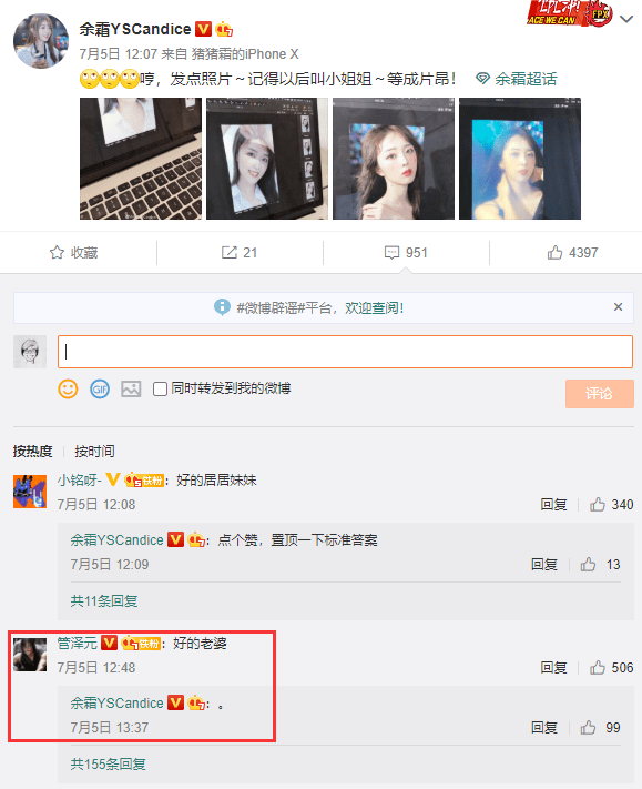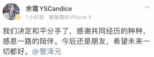 一切都来的十分突然,甚至7月5日,俩人还在微博亲密互动。管泽元在余霜微博下说道“好的老婆”,余霜也配合的回复了一个“。” 目前俩人分手原因未知。