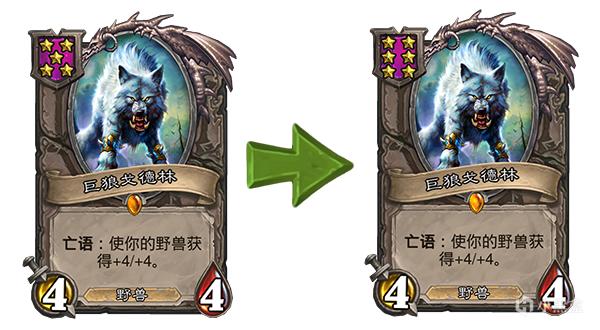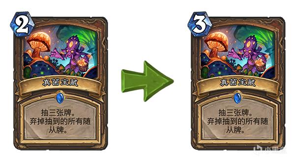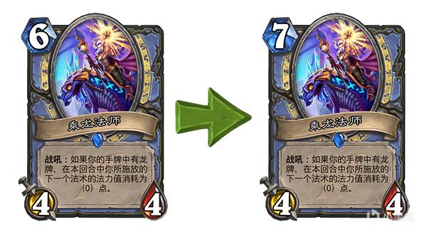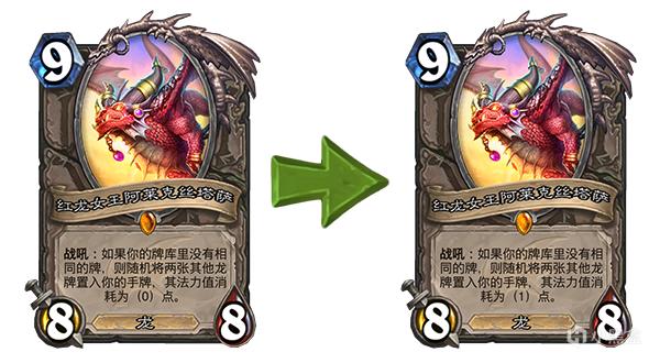 旧:战吼:如果你的牌库里没有相同的牌,则随机将两张其他龙牌置入你的手牌,其法力值消耗为(0)点。 → 新:战吼:如果你的牌库里没有相同的牌,则随机将两张其他龙牌置入你的手牌,其法力值消耗为(1)点。