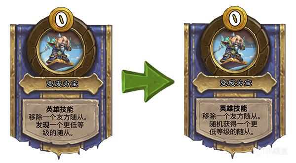 变废为宝[消耗0枚铸币]旧:移除一个友方随从。发现一个更低等级的随从。 → 新:移除一个友方随从。随机获得一个更低等级的随从。