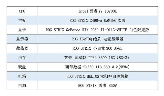随着秘藏在各个星球被挖掘出来,越来越多的秘藏猎人纷纷投身到追寻秘藏的事业中。想要先人一步掌控先机,一套优秀的电竞装备不可或缺。接下来,根据官方给出的游戏建议配置单,首先为大家推荐一套颜值与性能并存的十代酷睿潮流电竞平台,以华硕ROG STRIX Z490-A GAMING吹雪主板、Intel酷睿i7-10700K处理器、ROG STRIX GeForce RTX 2080 TI-O11G-WHITE白色显卡等令潮流玩家心动的电竞装备,搭配华硕其他主机硬件,带给玩家无与伦比的整机灯效和游戏体验!