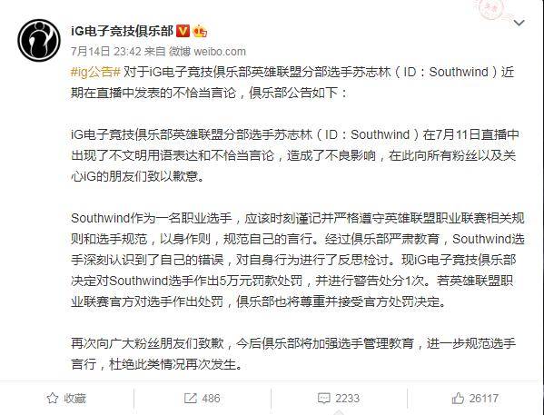 IG官方:Southwind作为一名职业选手,应该时刻谨记并严格遵守英雄联盟职业联赛相关规则和选手规范,以身作则,规范自己的言行。经过俱乐部严肃教育,Southwind选手深刻认识到了自己的错误,对自身行为进行了反思检讨。现iG电子竞技俱乐部决定对Southwind选手作出5万元罚款处罚,并进行警告处分1次。若英雄联盟职业联赛官方对选手作出处罚,俱乐部也将尊重并接受官方处罚决定。