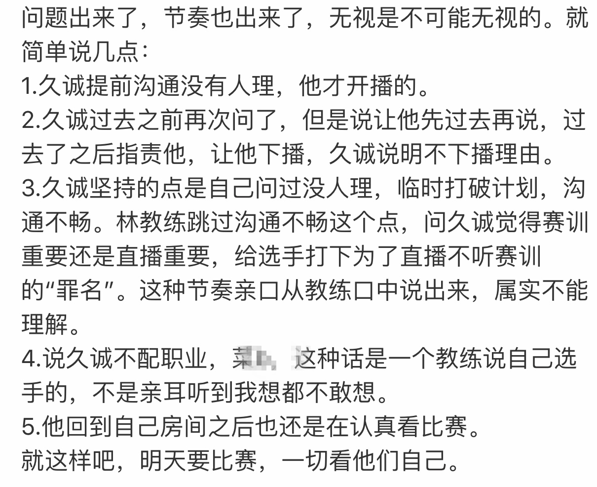 原来久诚从比赛现场看完比赛回去后,已经提前在群里问了是否有赛训,但是一直没得到回复,他就打算开直播继续看比赛,还和斗鱼要了推荐位。可直播中途林教练通知要集合赛训,久诚因为已经开了直播不想鸽掉平台,所以不想参加赛训。但林教练却不管这么多,直接在久诚直播间里质问久诚比赛重要还是直播重要,双方就这样吵了起来,可林教练吵得吵得已经失去了理智,直接对久诚进行人身攻击,说久诚是最不配打比赛的那个人,还说他是个打得菜。