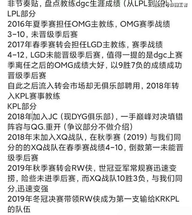 后来DGC来到XQ,XQ在那个赛季更是位列赛区倒数第一。随后在2019年KPL秋季赛,DGC执教世冠亚军RW侠,差一点让RW侠连季后赛都进不了。同时也让RW侠成了第一支在BO1赛制上输给KPLGT战队的KPL战队。