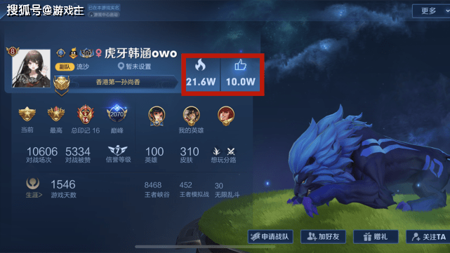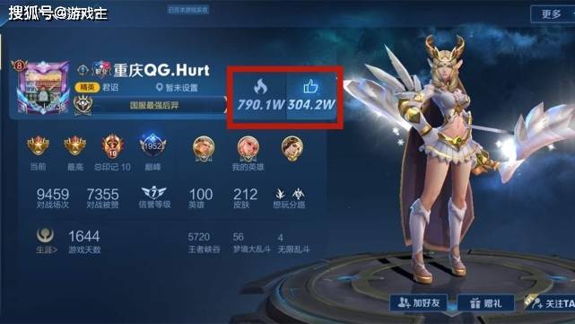 要说这款游戏中最高热度的职业选手,那绝对是梦泪无疑了。如今AG超玩会的不少粉丝,都是梦泪所带来的。只不过在游戏内的热度,梦老师却并没有游戏外那么高。点赞只有20w,热度只有100w,这可能是因为,梦老师不常玩这个账号的原因。但无论怎么说,老师的超高热度是没法否认的。