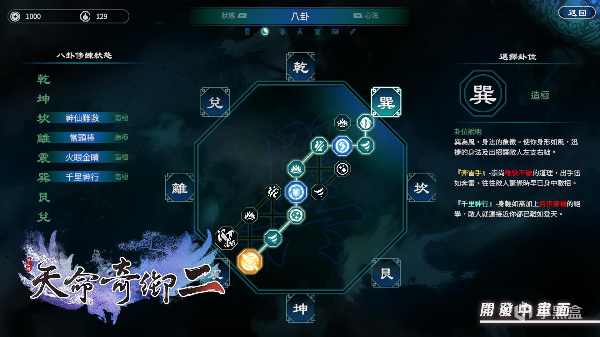 《天命奇御》著名的八卦系统仍是由最基本的干、巽、坎、艮、坤、震、离、兑构成,每个卦象都代表着不同的天赋与特性。八卦配点配合武学招式、心法配置,希望构成丰富多样的武学变化,让玩家藉此培育出多样的战斗特性。