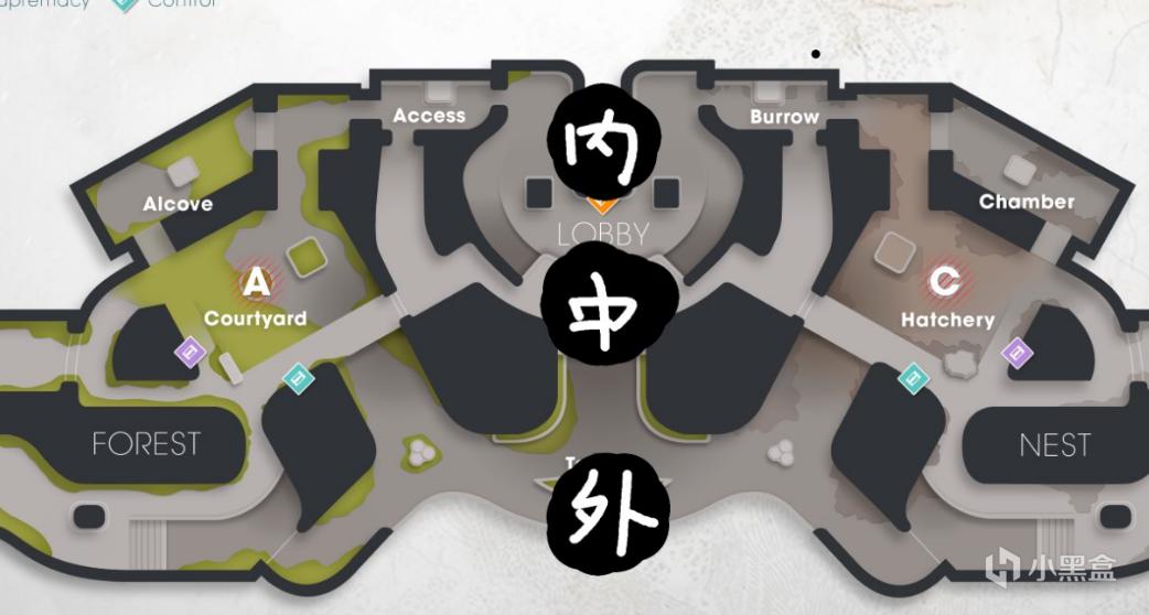 虫巢这张图主要分为内场(一楼B点、大厅Lobby)、中场(平台)和外场(斜坡)。乍一看有一点像偏远海岸内场(A点小路、C点和转盘)形成的三叉式枪线,但不同的是,虫巢的中场处于全图最高处,而内场如果想打中场,必须要让中场的人露出足够多的侧身,中场倒很好帮到内场与外场,而外场因为隔着墙的关系,想帮内场必须走与大厅相连的通道,丧失第一作战机会,且需要Jump shot(跳打)或者等中场露出侧身才能对中场的对手造成伤害。