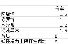 然后是背后增伤和妖怪空精力上限倒地增伤,这两个和水、混沌一样,也是游戏机制自带的增伤,背后增伤我测试大概X是1.5倍多一点,空精倒地的Y也是1.5多一点,但是根据我的测试,它两一起生效时不是XY直接相乘到2.25倍,而最多只有2倍左右。具体的也不需要测太准,反正知道有这回事就行。