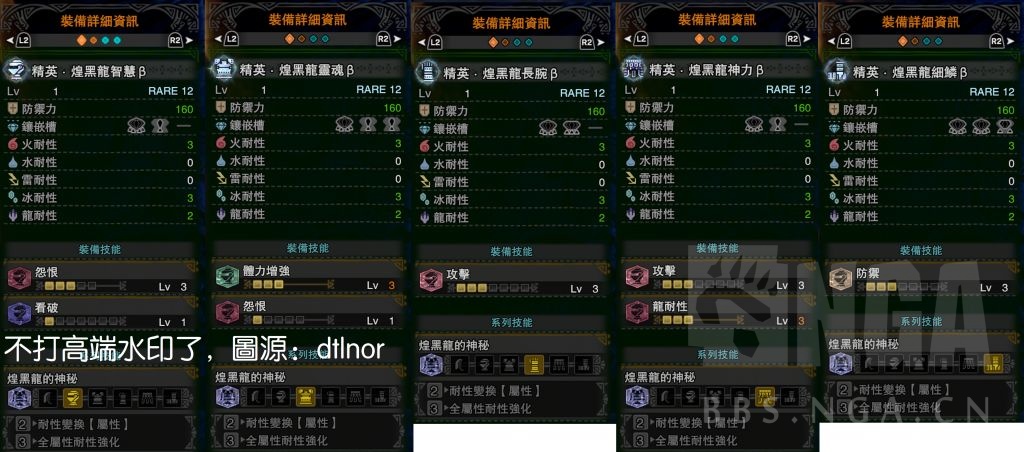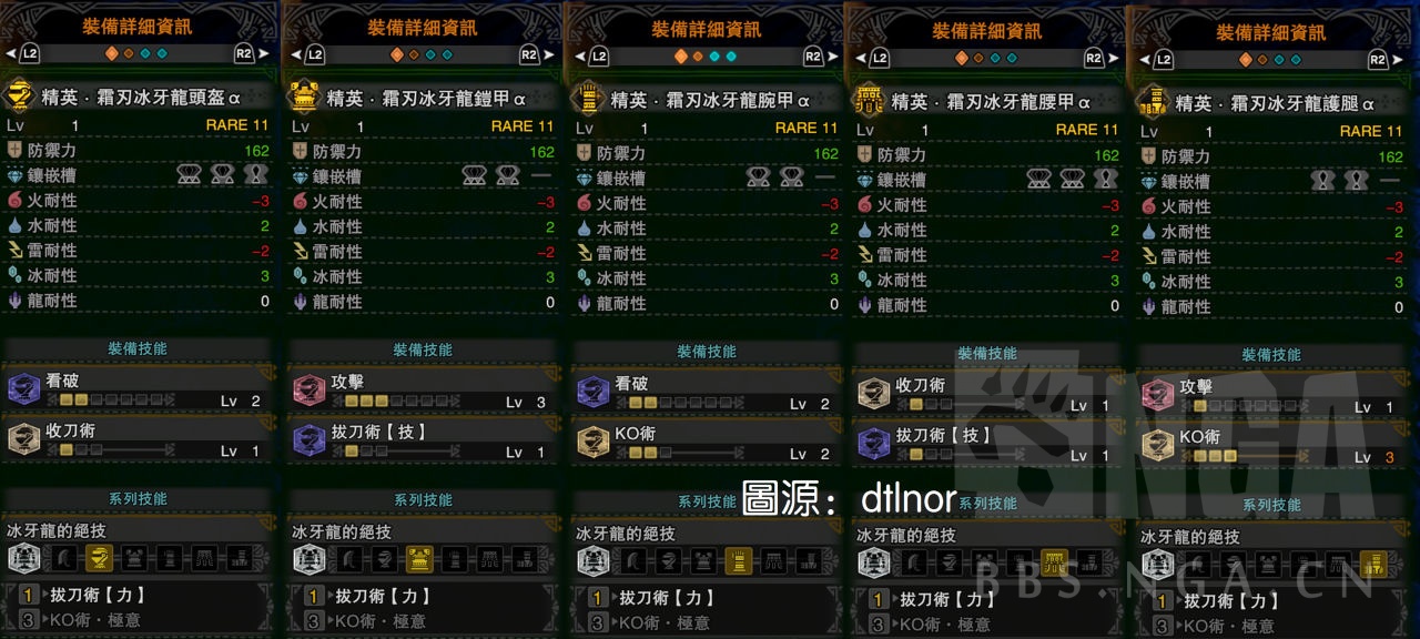 霜牙套一件自带拔力,比较有用的是头胸手三个部位,β套的孔位和猛爆β换算一下是等同的,α套分别舍去了一级或两级的四级孔附带技能换取了一级速纳,一级拔刀,两级击晕术,而煌黑的β手非常不错(终于能摆脱腾龙手了),在不考虑套装技能(拔力,挑7)的情况下极限配装中比猛爆和霜牙手更好一点(相当于三级孔+一级攻击和四级孔对比),煌黑α腰在龙属性配装中也比较有用
