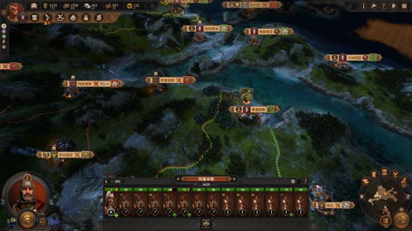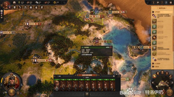 看下战神的配兵,第一回合绝对要招正规盾矛,由于我招的青年矛,导致相当长时间都是三神带17坑,后来才有的大只佬加入。这回合必须要和海上的势力停战,次回合往家里赶。