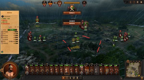 第一场战斗人比较少,想要低战损,需要近战全部蹲草,用投矛不断骚扰对方,击杀一定数量之后敌方就会从山上下来,然后近战伺机冲出来,包夹快速打击少部分敌人,追击投矛的敌人也会快速跑来支援,投矛大概只能一直勾引两只部队,我方主力可以逐一打崩对方的部队,此战略出上风。如果要绞肉,恐怕是要血战险胜的。