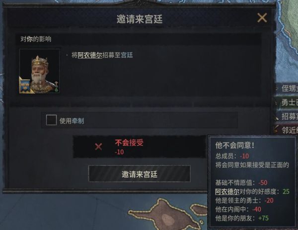 《十字军之王3》玩家们能够通过筛选来查看能够邀请的NPC,但是会有这些NPC不愿意来的情况,下面请看玩家“冈部哥”分享的《十字军之王3》邀请NPC来宫廷技巧,希望能为各位玩家带来一些帮助。