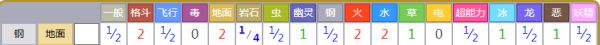 大钢蛇的属性和鼠头地龙一样是刚+地(部分小时候就没念对属性的小伙伴仍然亲切称呼为“铁系“+”土系”)。这个属性组合免疫电系和毒系,抗一般、飞行、岩石、虫、钢、龙、妖精7个属性。这里就可以看出有一些宝可梦常规配置就很难对付大钢蛇,比如说雷鸟龙(电+飞+龙)、毒藻龙(电+龙+毒)、铁蚁(岩石+虫+电+钢)、铝钢龙(龙+钢+电/恶)。但是千万不要以为大钢蛇的抗性就会很好,大钢蛇不抵抗的、弱的属性都是版本热门属性。比如说格斗(武道熊狮等)、火(喷火龙、嘎啦嘎啦、巨炭山等)、水(拉普拉斯、雨天兄弟、海兔兽、玛力露丽等)、地面(海兔兽、重泥挽马、超甲狂犀等),草和冰、恶、幽灵属性对上大钢蛇仍然能发挥正常水平。