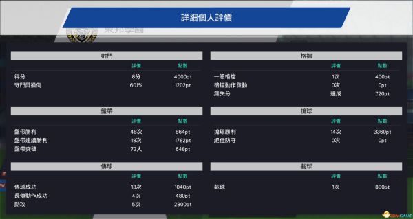 一般格挡尚不知为何。格挡动作发动只有刚好站在对方射门路线上才能完成。无失分,前锋和中场720pt,后卫1200pt。