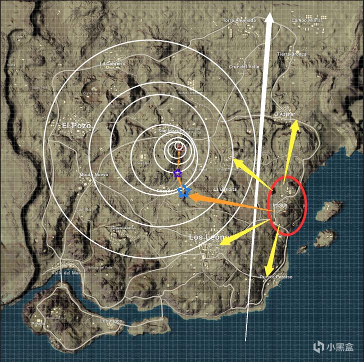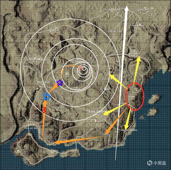 emm,为了避免前期掉人,我个人不是非常推荐从北部进圈,因为大家从上面的资源点标记可以看出,中北部的资源点很密集,而且地形非常崎岖,不利于开车转移。所以我举例了三种思路作为参考,图中橙色箭头标记为转移路线,蓝色星号标记为战略点。