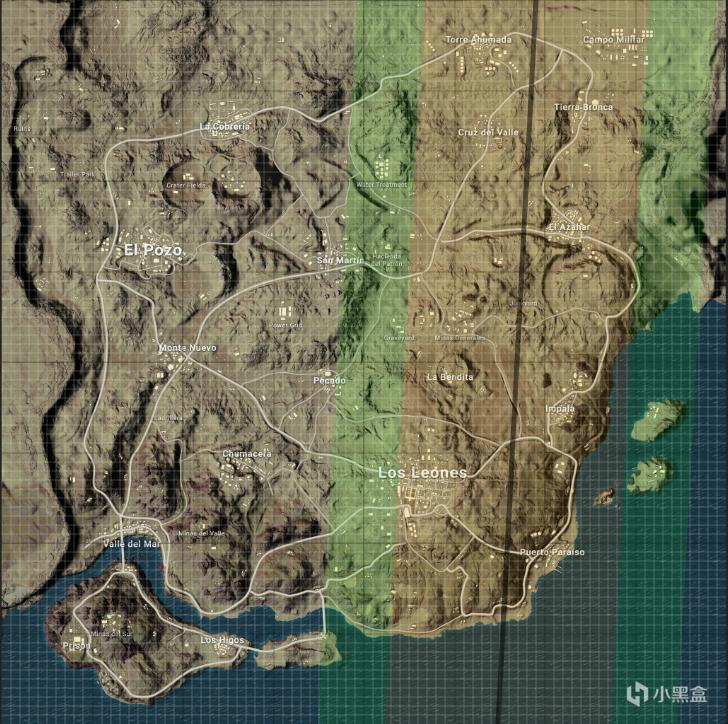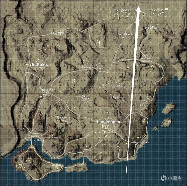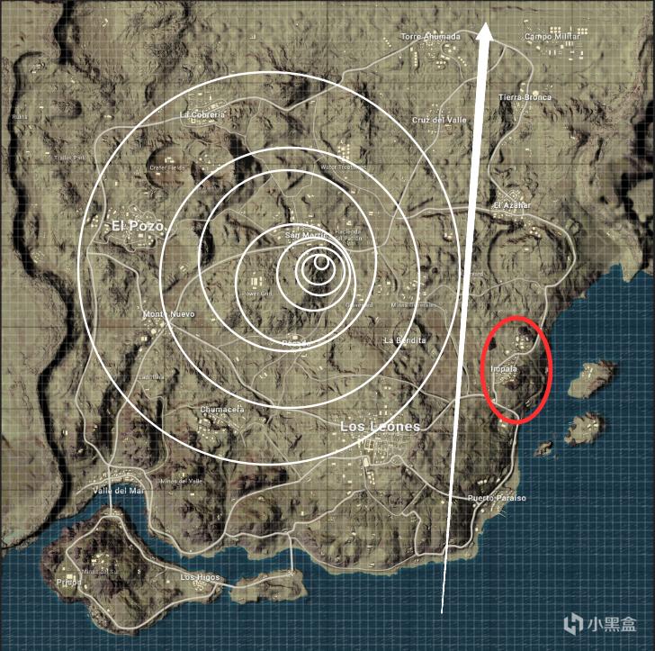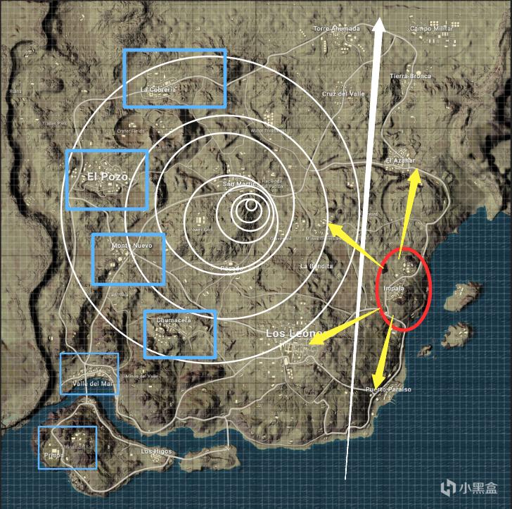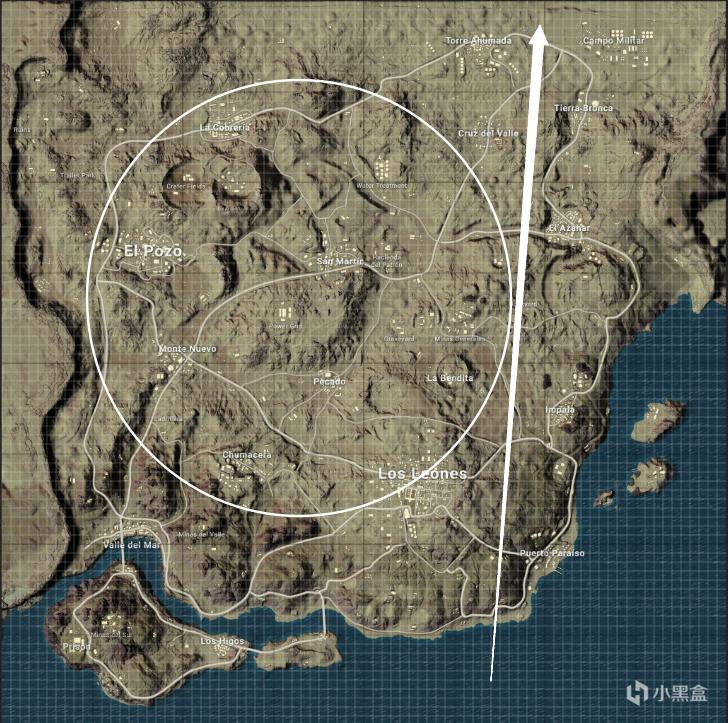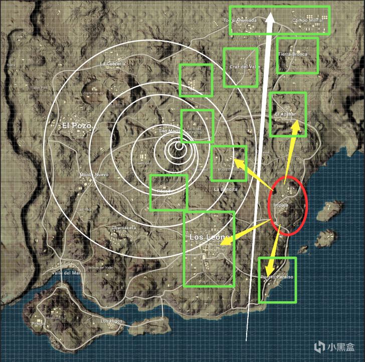 如果2号方案拿下了战略点,在前期我们可以进行埋伏敌人,也可以观察圈内各个点位的人员情况,因为航线偏东侧,当圈型收缩压缩队伍的生存空间时,圈型中部东侧的队伍会比较多。在相对安全的情况下,可以对一些过路的队伍,小野区和“墓地”的队伍进行干扰和劝架。收益会高于1号方案和3号方案,同时风险也最大,因为这个战略点,有很多近点队伍在你打架的时候会有想法。所以,在这个战略点,观察保护位非常重要。然后随着圈型刷新,有机会可以直接拿下紫色星标的房区,这是圈型刷新后最具价值的房区。如果觉得机会太小,那就只能去皮卡多的房区暂时待着,打架,然后再进行下一步操作。随后依靠山体进行后续操作。比较看个人能力吧,因为我们在游戏中时,无法预测圈型刷新,只能尽力为之。