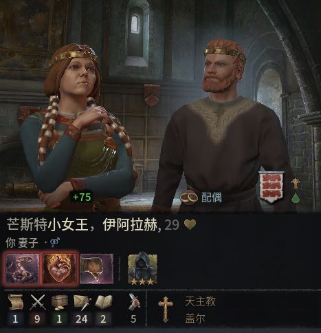 芒斯特小王国由于信仰海岛基督教,一夫多妻制在前期可是巨大buff,娶妻我的思路为正妻管理和知识优先找20+的,其他数值10+即可,有无遗传无所谓。三个小老婆找一个谋略20+的作为内阁使用,其余优先天才。