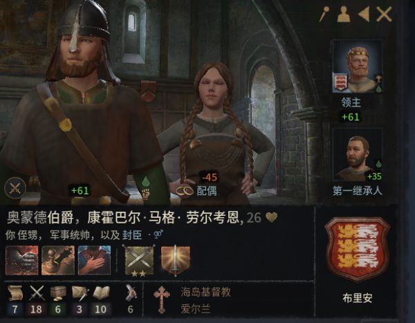 一代目,开疆拓土(统一爱尔兰全境),培养人才(继承人、内阁)。作为游戏里教程和剧本的家族,领主角色的属性值是固定的(除剧本外,其他领主属性为随机生成),但是技能点前期是随机的,建议刷出来侠义骑士路线后再进行游戏。