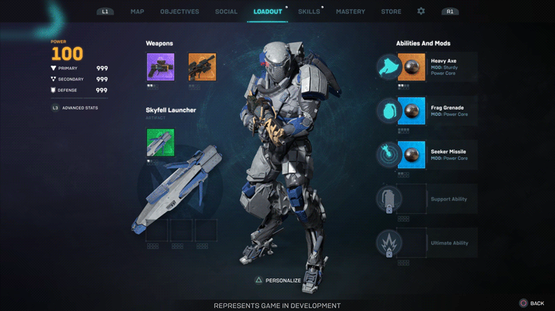 这是因为当《圣歌》2.0发售时,技能将成为可解锁东西,不再和掉落装备有关。这些技能可被玩家控制,能从Loadout配备菜单中调整。技能仍然可以自定义,不过仍然需要模组,以赋予其属性或power。词缀改进了build一致性,但不再是主要因素。BioWare展示的一个例子是近战技能,玩家可以选择重斧或火焰斧技能。这个技能的模组赋予“强健”,但属性没有详细说明。