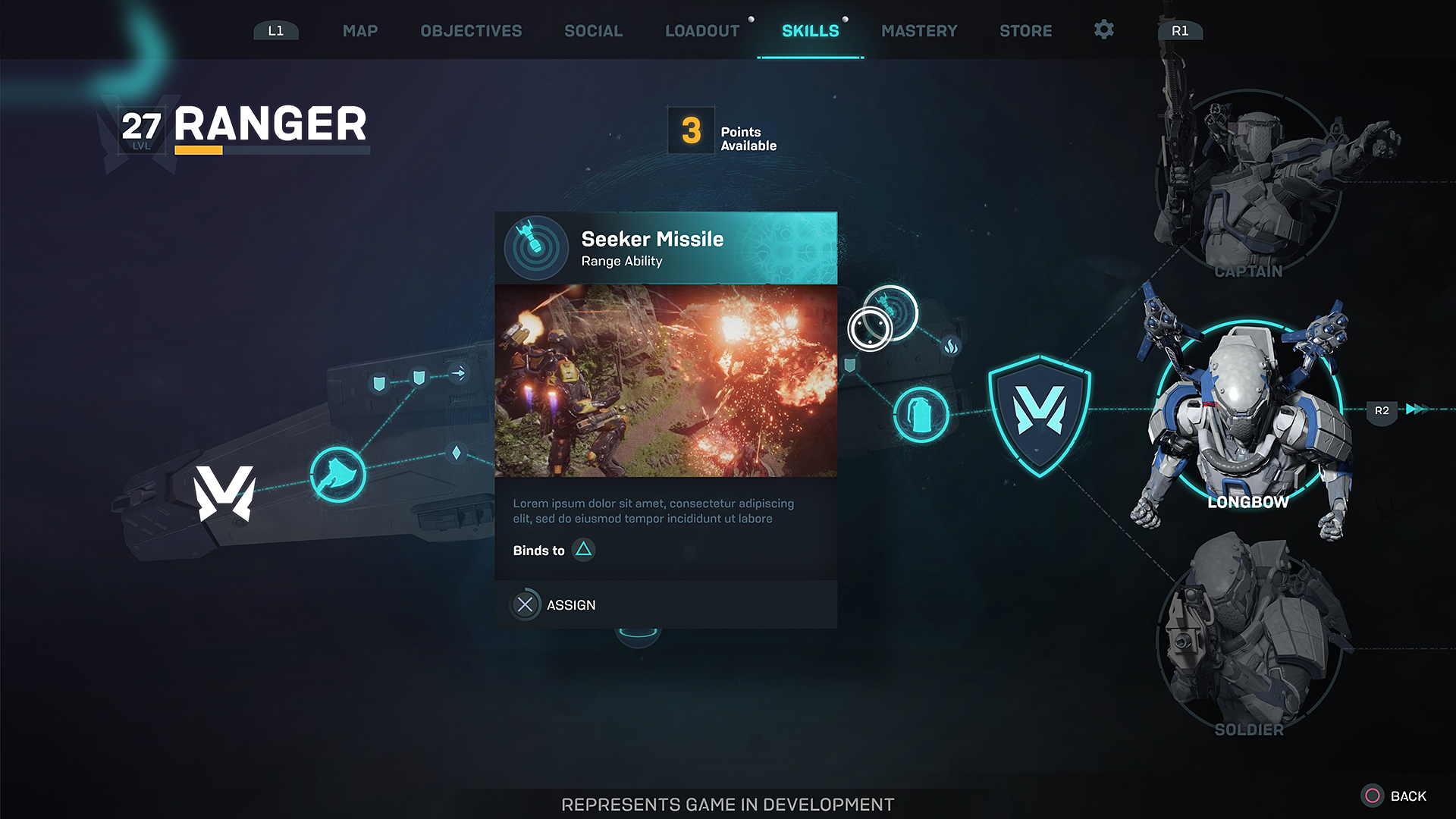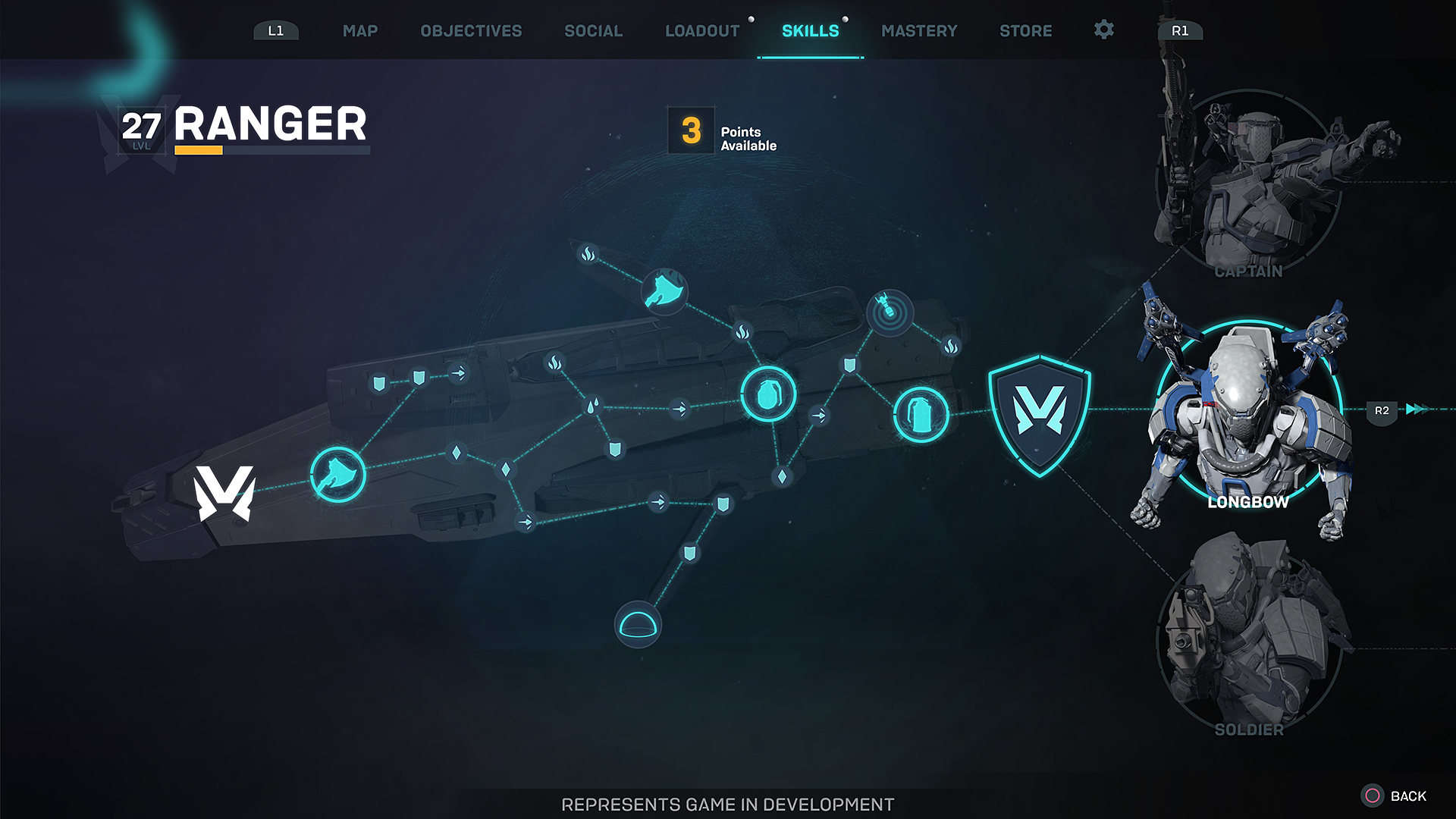 每一个机甲有基础技能树和专精。当基础技能树完成时就会为机甲解锁一个高级的技能树。比如使用游侠号机甲,就有队长,Longbow和士兵三个专精概念,每个专精有自身的高级技能树,包括可解锁的技能,被动和属性加成。