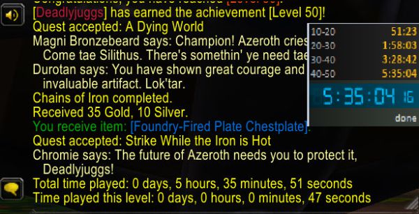 该玩家从10到50级,总共用了5小时35分,刷新了最快的升级记录。要注意的是,这名玩家选择的是狐人,利用了种族天赋,为赶路和回城学骑术,节省了不少时间。其他比如法师的传送,武僧的禅宗朝圣,黑铁矮人的钻探机等等,也能做到这一点。所以在种族或职业的选择上,也是很重要的。