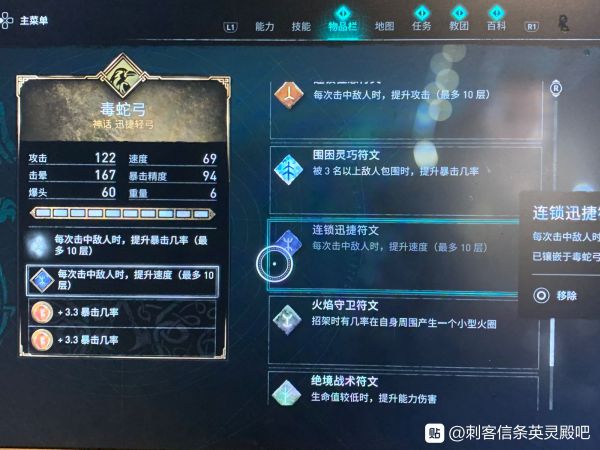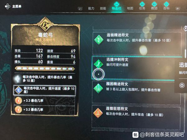 5.武器菱形符文:连锁迅捷符文(核心),迅捷冲刺符文(可选,经测试其buff时间很短只能打两次轻击,不过可以用轻击积累的方法,也就是两次轻击后闪避接重击),围困灵巧符文(增加暴击,原理同2)