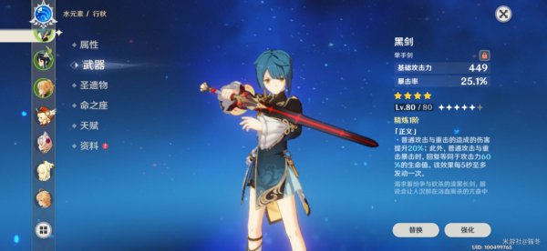 再提暴击向的,月卡向的黑剑能提供稳定暴击属性,攻击力增幅也中规中矩,能帮助行秋将暴击值稳定在一个可观的面板,60暴左右。