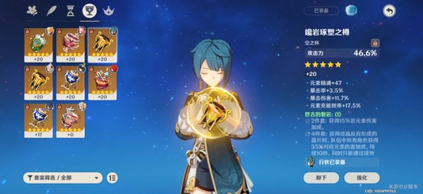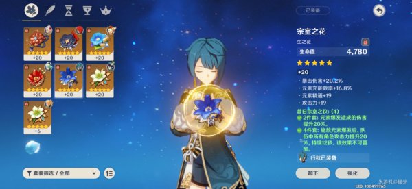 意思就是五个位置圣遗物加上一把武器,一个位置携带主精通属性的,再用副词缀堆些精通充能,牺牲部分暴击爆伤,不要求攻击加成副词缀,从而提高综合使用效能。使行秋变成一个伤害不错,辅助良好,充能尚可的角色。