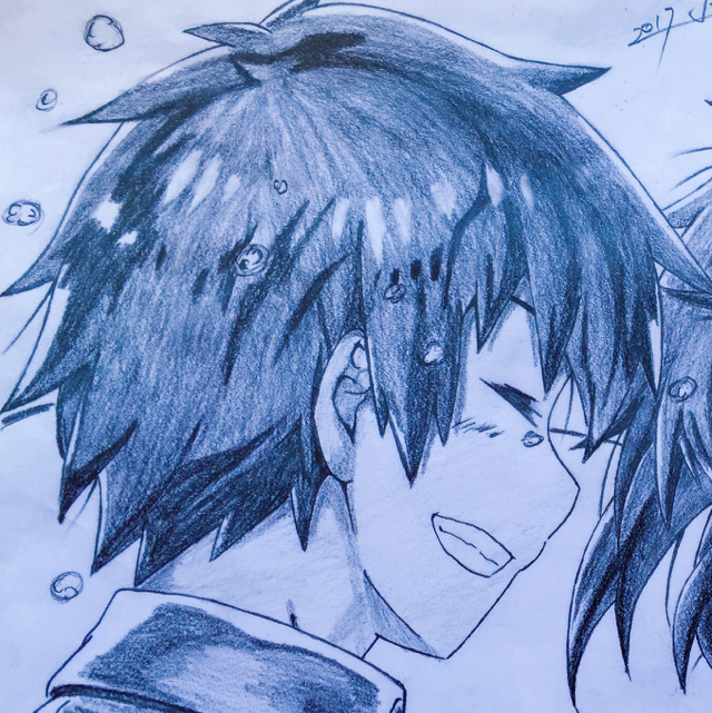 “哎…?”恍惚中女孩看到自己面前滑稽的巨大鱼脸,又看看正在忙碌的白衣少年“啊嘞?”