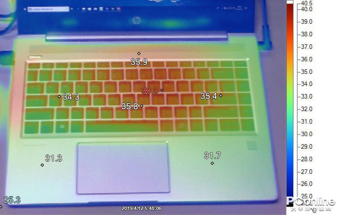 在散热测试中,通过AIDA64进行15分钟的烤机测试,全新惠普战66二代AMD版的C面最高温度为38.3℃,平均35℃左。另外掌托处的温度只有30℃左右,在长时间使用中并不会让双手有明显的不适感。