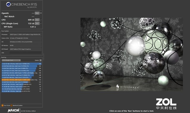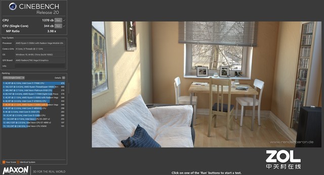 使用CINEBENCH R15和CINEBENCH R20对这颗处理器进行测试,前者单核得分132cb,多核得分609cb;后者核得分344cb,多核得分1370cb。从单核成绩来看,AMD Ryzen 5 3500U因频率影响相对低一些,但是多核成绩基本达到了主流低功耗处理器的水准,在处理多线程任务时有着不错的效率和计算能力。