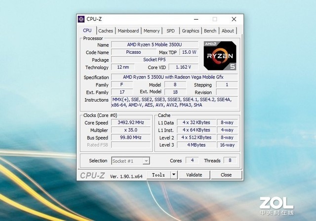 AMD Ryzen 5 3500U处理器是一颗4核8线程的处理器,TDP为15W,基于12nm制程工艺设计,三级缓存4MB,基准频率2.1GHz,最大动态加速频率3.7GHz。