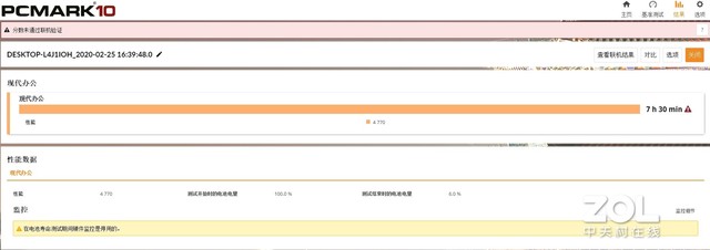 续航方面,我们使用PCMark 10办公模式对其进行了测试,在屏幕亮度为50%、连接WiFi的情况下,最终续航成绩为7小时30分钟,可以满足用户一天不插电办公的需求,续航能力表现非常不错。