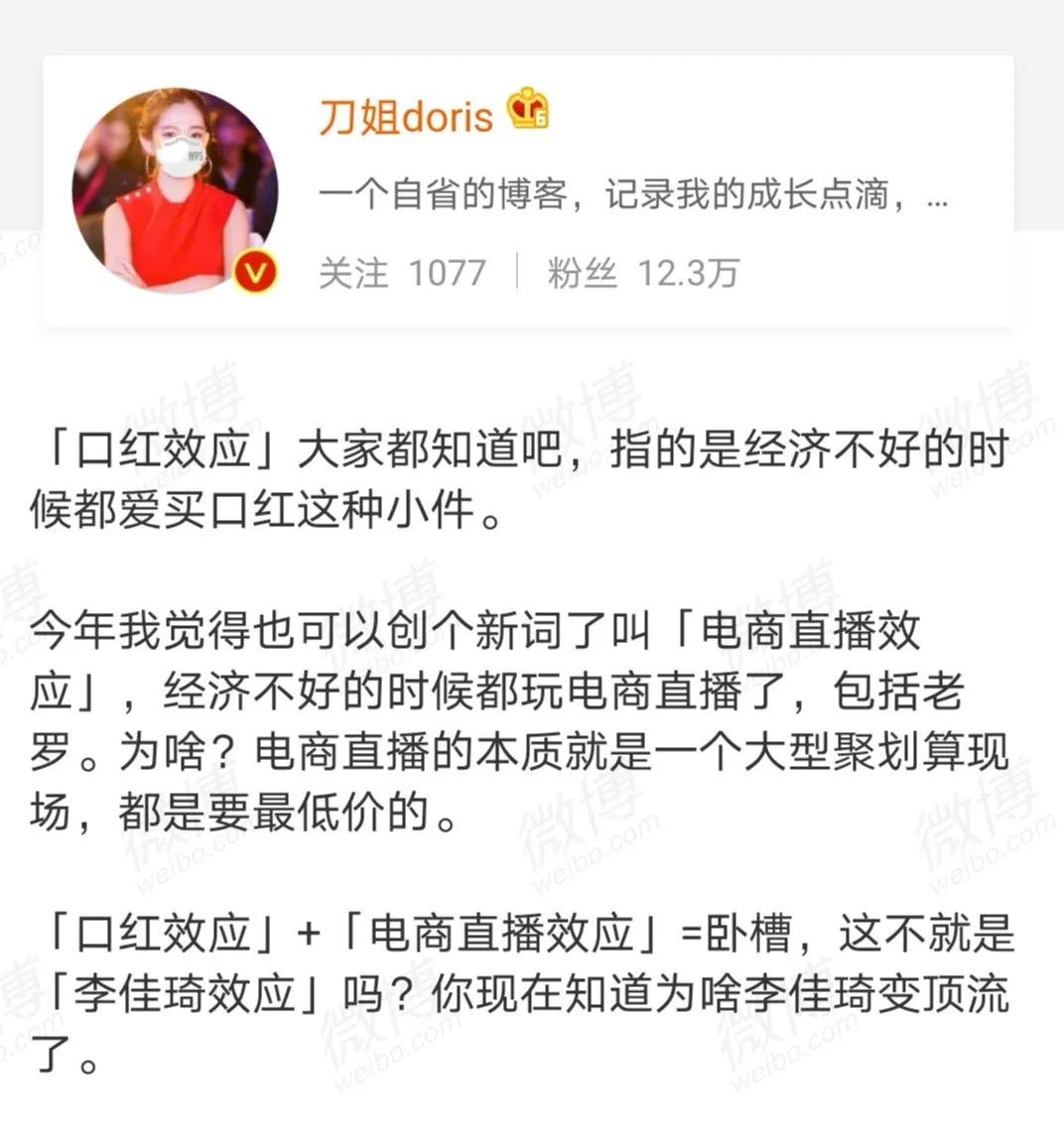 女子刀法创始人刀姐doris在微博吐槽:“今年我觉得也可以创个新词了叫‘电商直播效应’,经济不好的时候都玩电商直播了,包括老罗。为啥?电商直播的本质就是一个大型聚划算现场,都是要最低价的。”